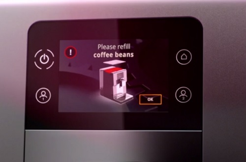 O indicador luminoso intuitivo, por cima do recipiente apara-pingos, acende-se a vermelho e aparece no visor uma mensagem a pedir-lhe para encher o recipiente de grãos de café ou o depósito da água.